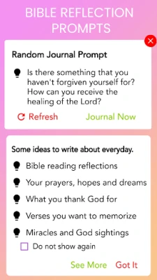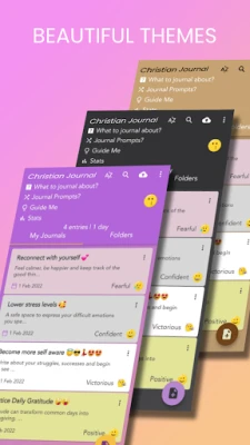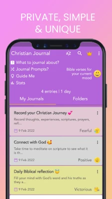 Christian Journal is your #1 Christian App designed to help you connect with God through Christian journaling, Bible Journaling and Bible meditation. This journal app comes with Christian diary with a lock, prayer journal, gratitude journal and mood tracker for daily reflection. Our guided journal with Christian Journal prompts is designed to help you stay focused and grounded in your faith, directing your inner dialogue to God and the plans He has for your life.