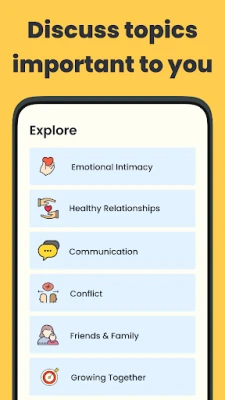 Our app’s guided conversations, paired with thought-provoking daily questions, will help you uncover the values that help you bond as a couple. From shared dreams to mutual beliefs, you'll explore relationship values and create a deeper connection built on understanding and respect.