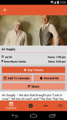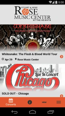 Use our app to stay on top of the latest concerts! • View upcoming concert details • Buy tickets, add concerts to your calendar, and set concert reminders! • View our FAQs, get directions, and view seating charts • Get emergency notifications from Rose Music Center at The Heights